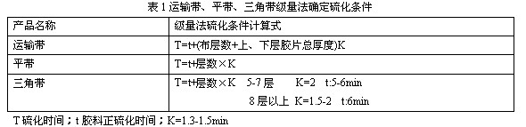用_量法制定運輸帶、平帶、三角帶等產(chǎn)品方面早有成熟的經(jīng)驗式(表1)。在50年代我們常用每毫米1.5-2.5分估算外胎的正硫化時間,由于技術條件不同(配方、骨架材料、硫化外壓溫度、過熱水溫度、水胎厚度、硫化方式)再加上人的經(jīng)驗上的差異,估算外胎的正硫化時間誤差_大。