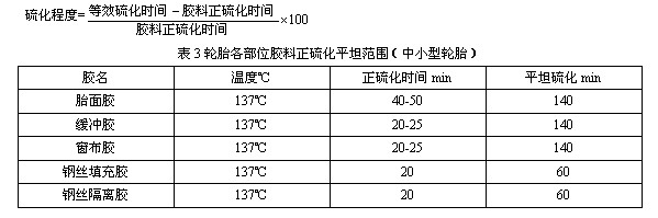 5、胎面硫化程度應控制160%,輪胎生產(chǎn)質量才能穩(wěn)定,硫化平坦范圍如(表3)。